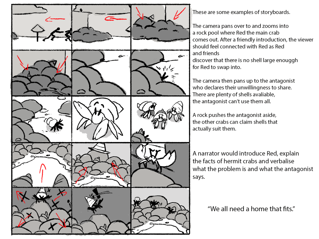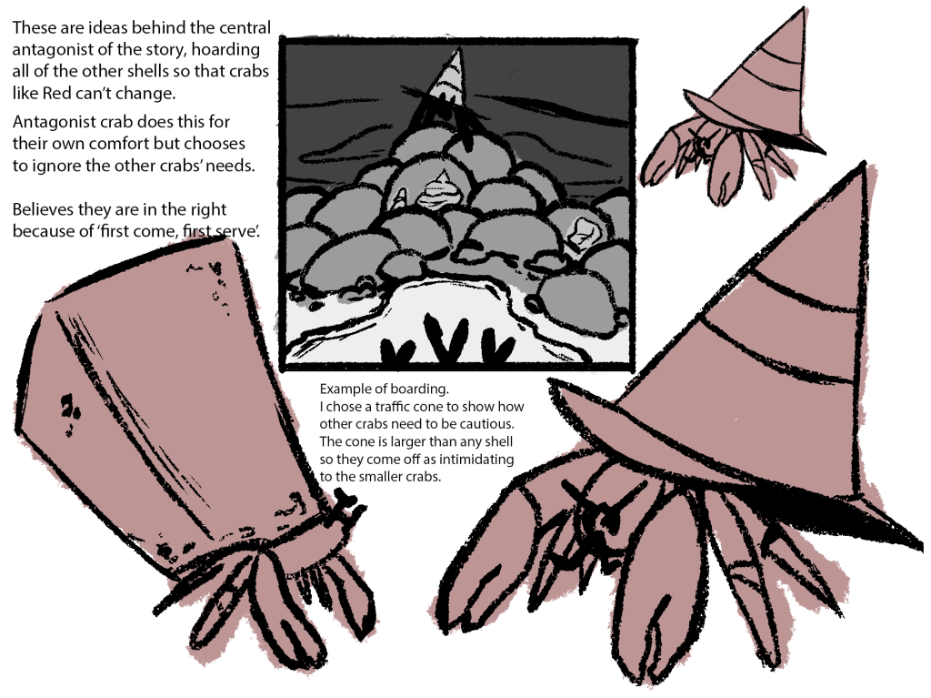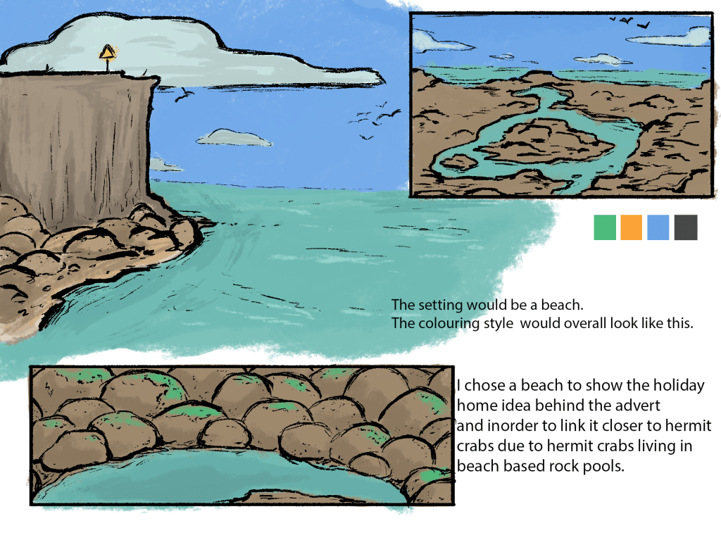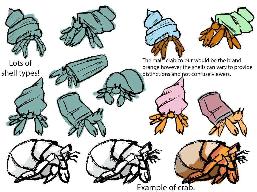 Assigned with pitching an idea for a short animation encouraging the audience to look into reaching out to or supporting a company dedicated to finding people homes, I created a small pitch orientated around hermit crabs- a species known for switching shells as they grow (an analogy for the need for homes especially homes that suit the people living in them).